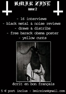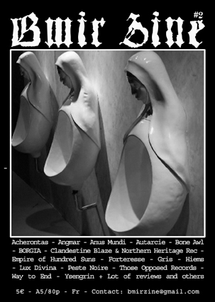 Le deuxième numéro du BMIR Zine vient de sortir. 80 pages N/B en format A5, écrit en bon Français, à la mise en page pro et à l’esthétique travaillée. 16 interviews intéressantes et poussées de groupes Black Metal Underground (Acherontas, Angmar, Peste Noire, Autarcie, Clandestine Blaze, Bone Awl, Gris…), chroniques, dessins et autres…